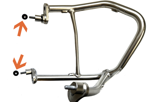 *X-HeadとGSやGS AdventureのBMW純正エンジンガードを併用する場合は、エンジンガードとのクリアランスを確保するためエンジンガード下部2箇所のボルトにスペーサー(左右で4箇所)を別途追加する必要があります。