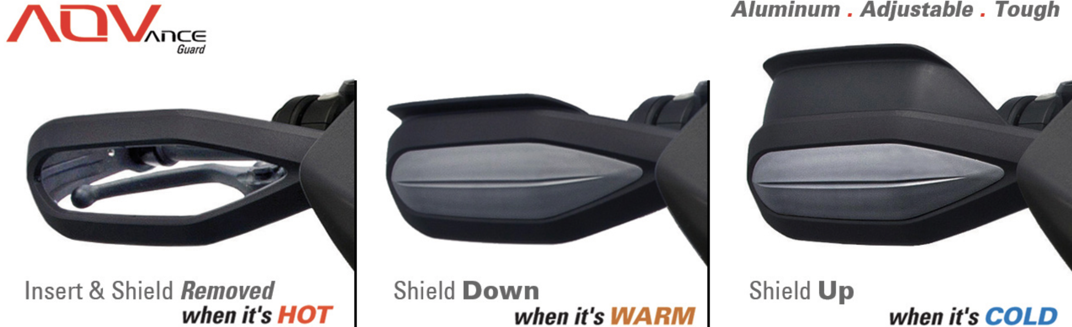 インサートは、弾力のある射出成形ポリプロピレン製で、フレームの開口部へ簡単に取り付けが可能です。内側の固定タブにより着脱が簡単。スライディングシールドは、インサートの背面とフレームのピボット点に支持されています。高さ 50mm の範囲で調整可能なシールドは3 本のノブより、簡単に調整が可能です。最も高くした状態ではフレーム下部から垂直方向のカバー範囲は142mmとなり、どのOEMハンドガードよりも高くなっています。オープンフロント状態での高さは98mmです。